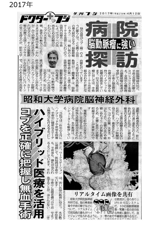 紹介記事 ★脳神経外科速報 私の手術論巻頭対談 2019 4月 ダウンロード 脳神経外科速報 私の手術論 巻頭対談 2008年ダウンロード 夕刊フジ 病院探訪 脳動脈瘤に強い 2017 4 ダウンロード 夕刊フジ 日本の名医 50人 2017 4ダウンロード